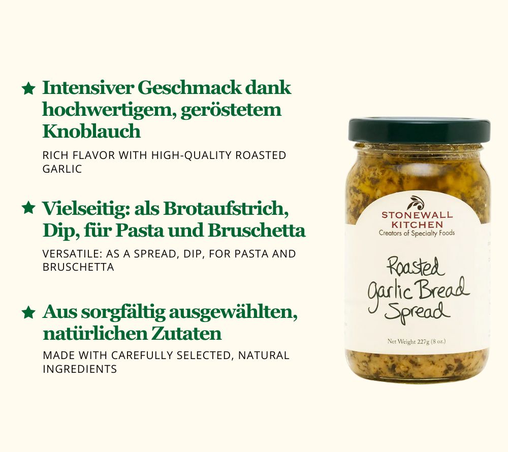 Unser Roasted Garlic Bread Spread aus der Manufaktur von Stonewall Kitchen aus Maine ist mehr als nur ein Brotaufstrich – es ist ein kulinarisches Erlebnis. Die sorgfältige Auswahl der Zutaten und die schonende Verarbeitung garantieren höchste Qualität und Geschmack. Ob für den täglichen Gebrauch oder besondere Anlässe, unser Knoblauchaufstrich ist die ideale Wahl für alle, die den Geschmack von geröstetem Knoblauch lieben. Von Gourmets für Gourmets.