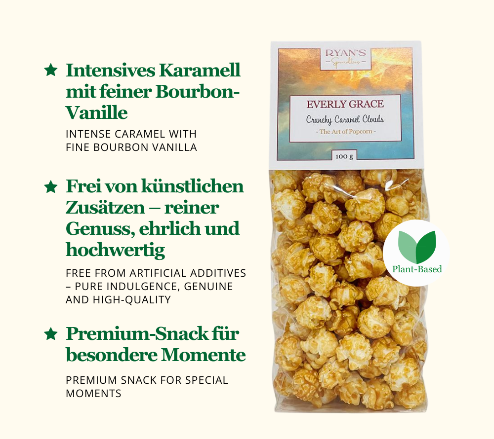 Gönnen Sie sich eine Auszeit mit einem Snack, der das Alltägliche übertrifft. Crunchy Caramel Clouds – Popcorn in seiner edelsten Form, aus der Popcornmanufaktur Everly Grace.